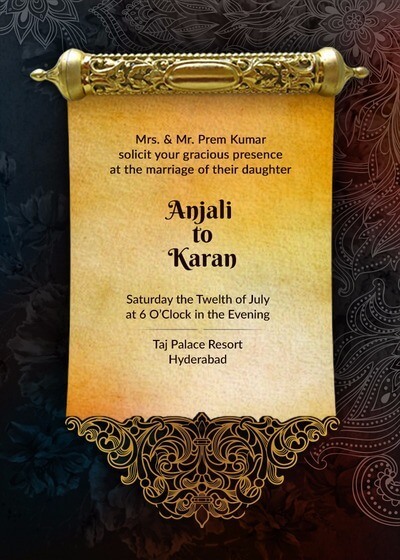 In ancient times, the most important news was carried to the four corners of a kingdom in the form of a scroll, to be read out as announcement and ultimate wish of the ruler. Reminiscent of this practice, and for spreading news by no means any less important, this online invitation places a royal scroll, unfurled from its golden case to reveal its message to the intended recipient, against a combination photo-and-sketch background that serves to accentuate the importance of the scroll. Variation