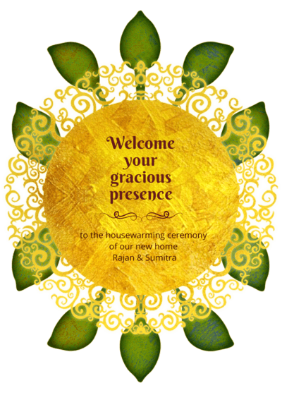 A beautifully conceived circular design, bordered by fresh greenery, and embellished with a golden overlay, makes this a Housewarming Invitation that will be received with pleasure. The focus of this particular design is its center, and all about the manner in which its individual elements draw the eyes to this location where the message of this online invitation is presented, on what appears to be a swathe of gold leaves, highlight the magnitude of the importance that this gathering to celebrat
