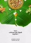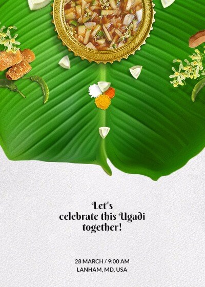 What better way to invite your friends and family to join you in celebrating Ugadi, than by using this particular Festival Invitation to make them feel wholly welcomed. How does this online invitation do this, you may wonder. Simple. It makes a symbolic offering to each person who receives it in the manner in which the special Ugadi pachadi is placed upon an open banana leaf, its end facing the recipient as it is likely to do so when offered to them. For added effect, key ingredients of the pach
